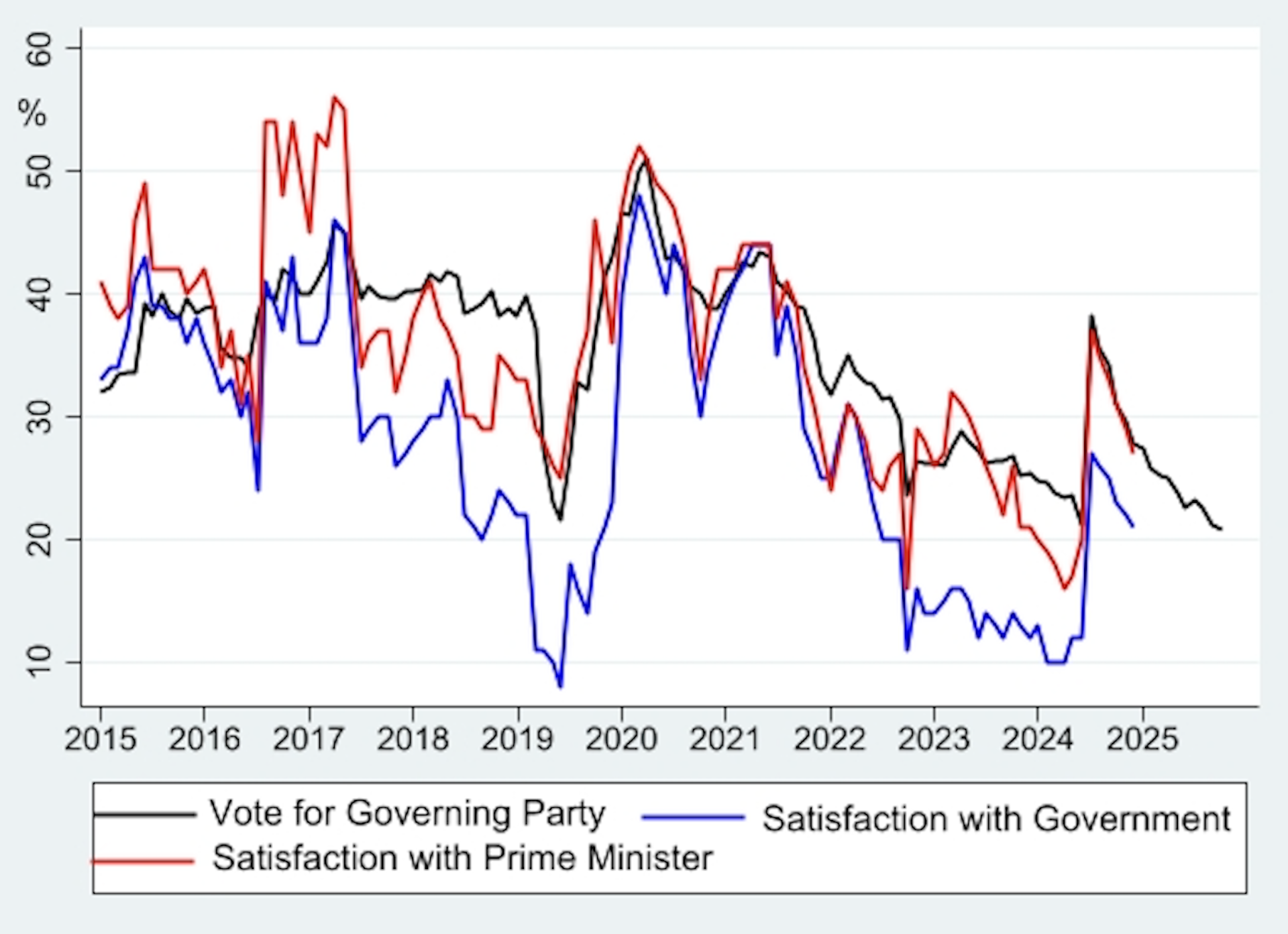 Trends in voting intentions, satisfaction with governments and with prime ministers for governing parties, 2015 to 2025: