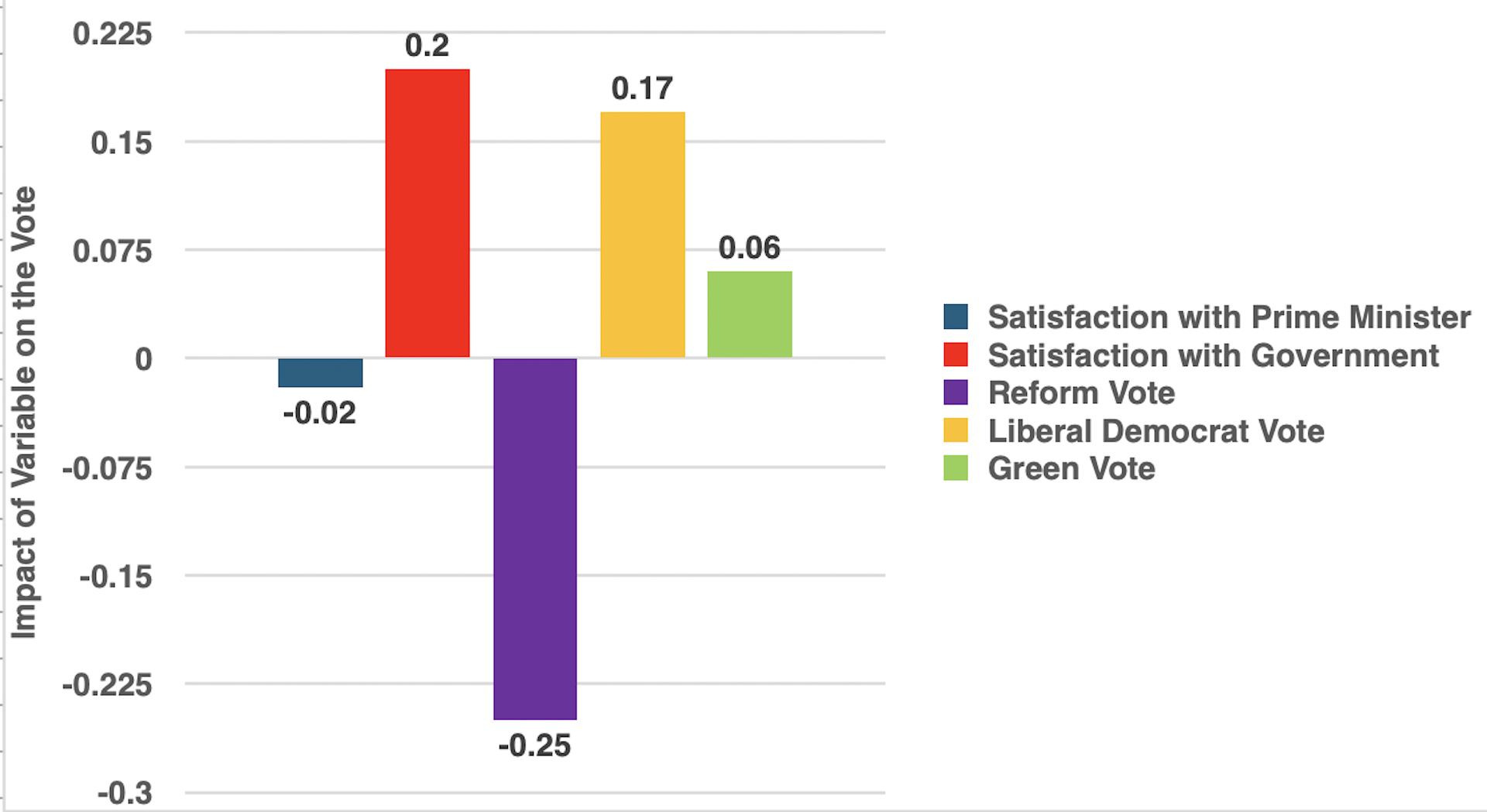 These complexities ensured that Liberal Democrat support increased with government support as some voters were drawn to Reform, or when Labour took over as the governing party. Finally, the impact of the Greens on government support was negligible.